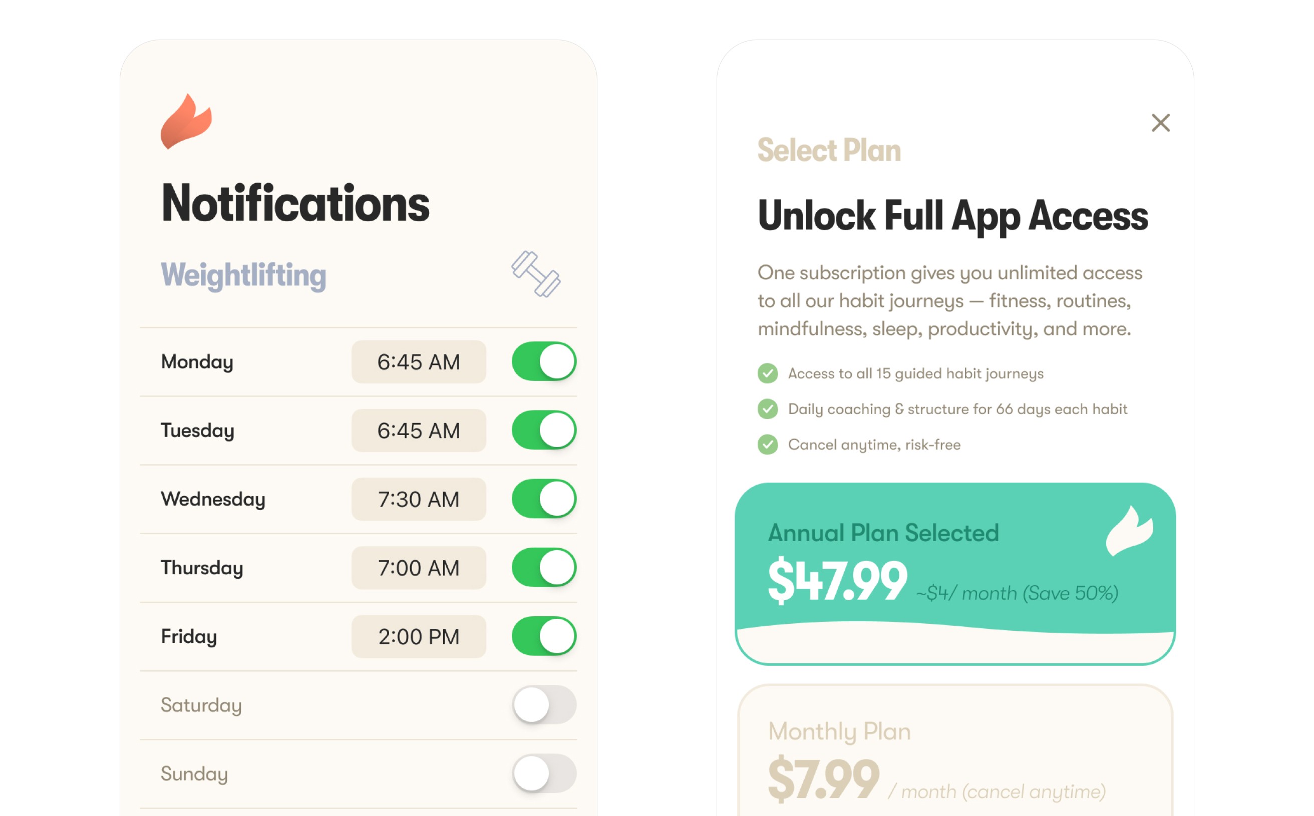 A unified UI system was designed to maintain consistency across habit journeys while reinforcing a calm, supportive tone. Components, layout patterns, and interaction rules were built to scale across new habits, features, and future product expansion.
