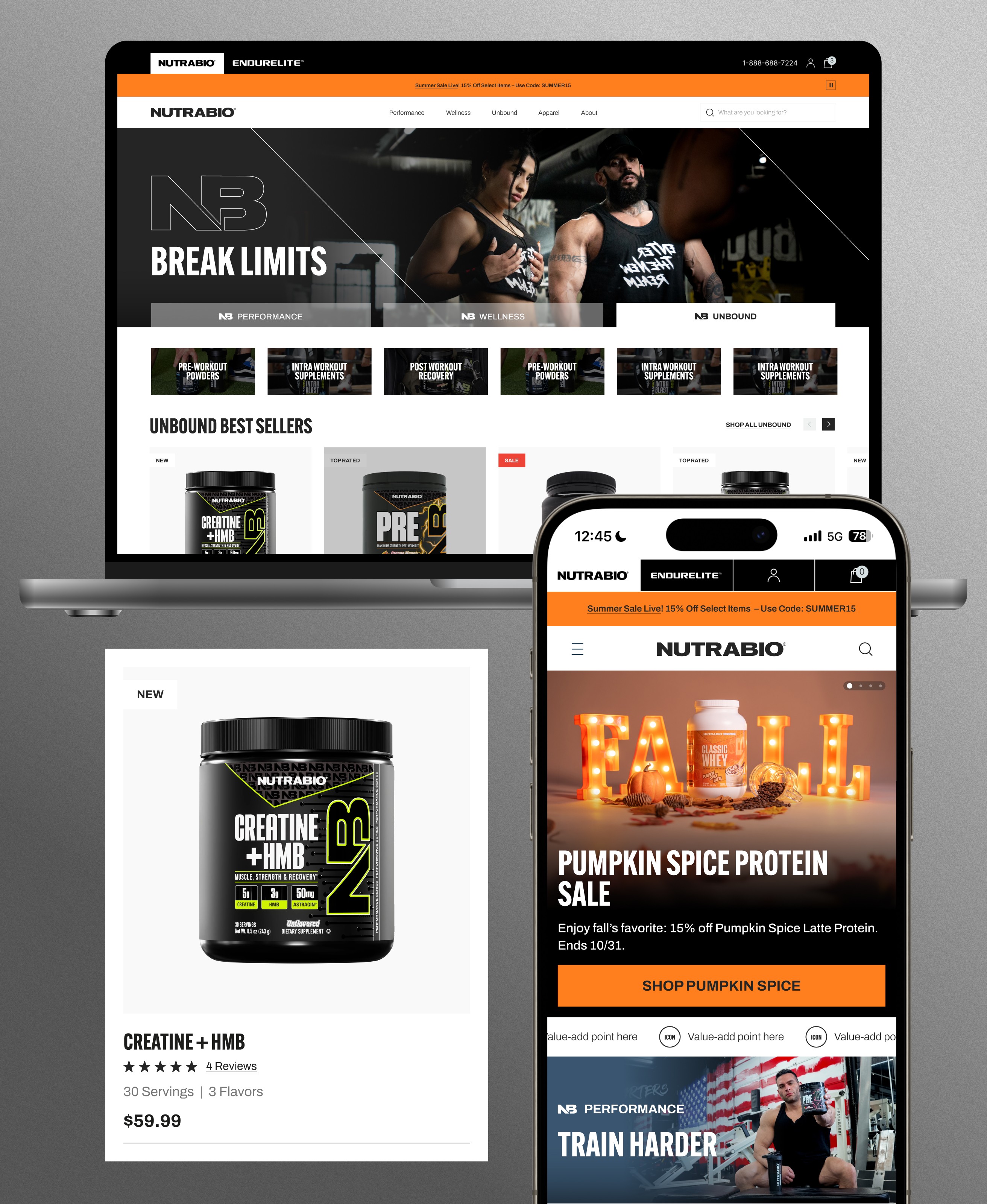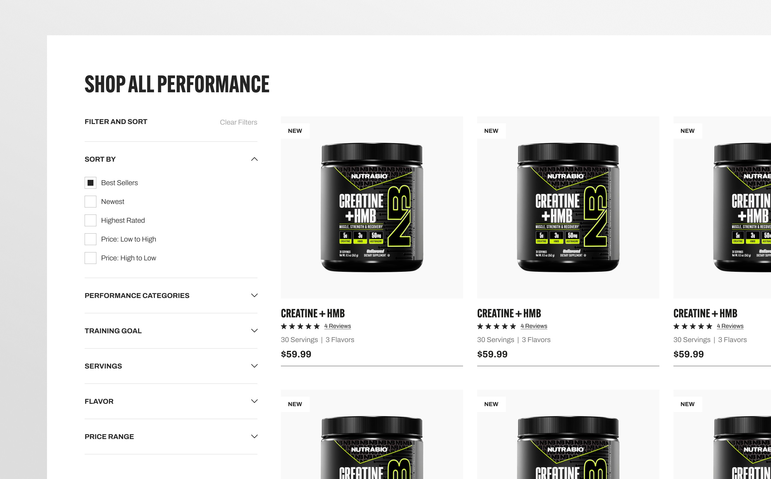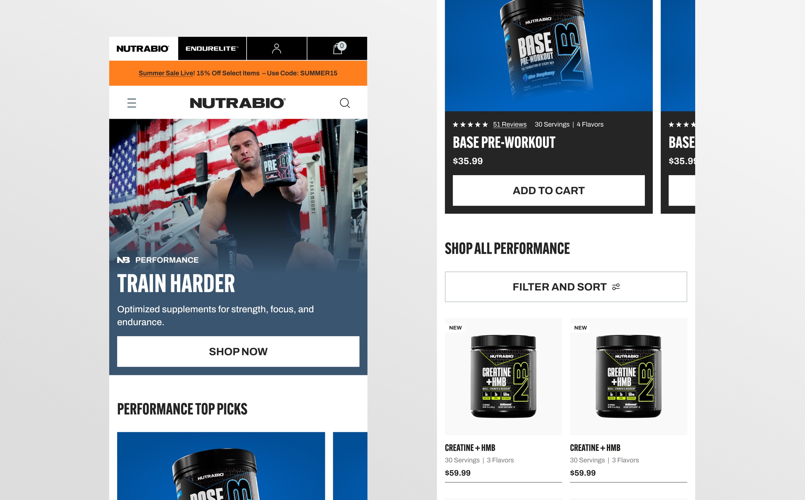 The redesign delivered a more premium, conversion-focused eCommerce experience aligned with NutraBio’s scale and market position.