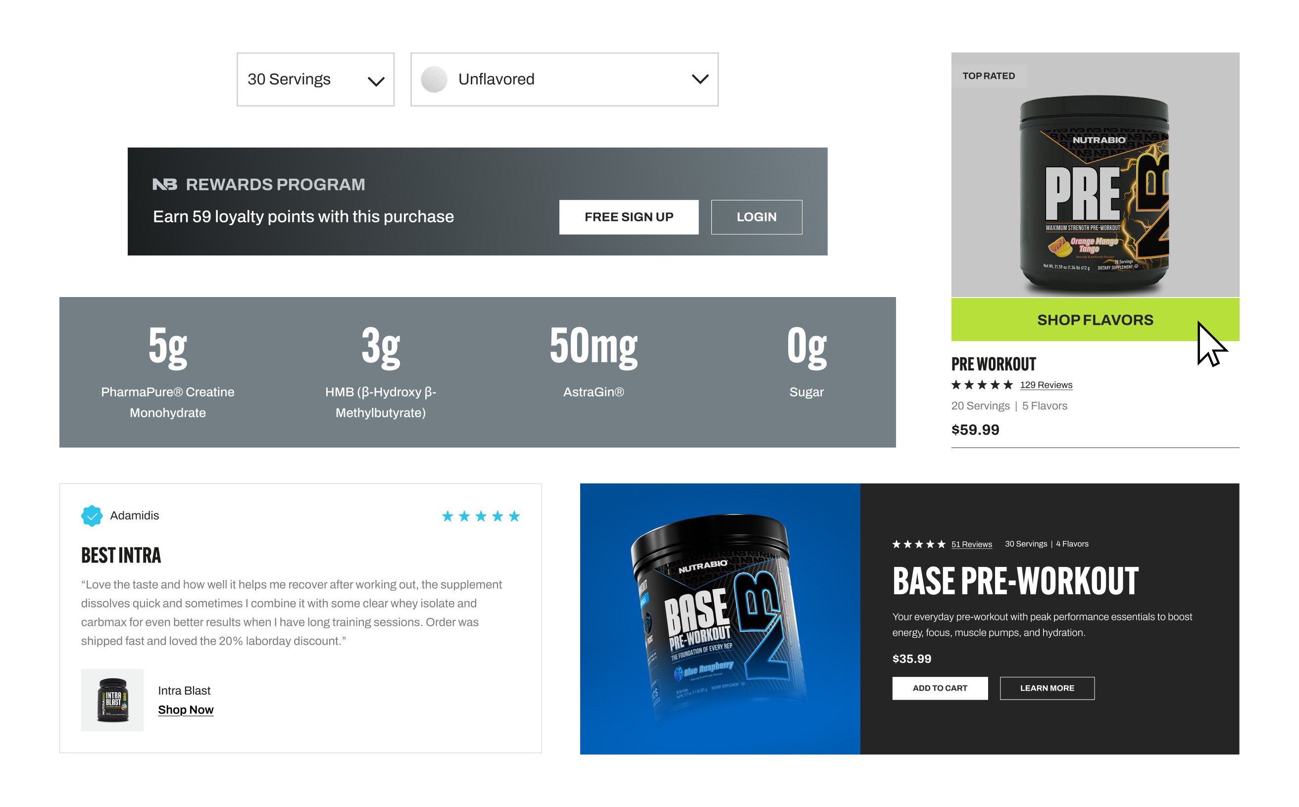To match NutraBio’s scale and product credibility, the design system was updated to feel more premium and competitive within the supplement category. Visual hierarchy, typography, and spacing were refined to increase trust and clarity, while the overall UI language moved toward a modern eCommerce standard expected by high-performing competitors.